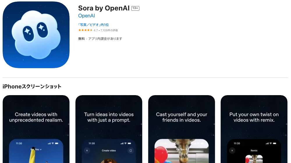 - App StoreからSoraアプリをダウンロード(現在招待コード不要)