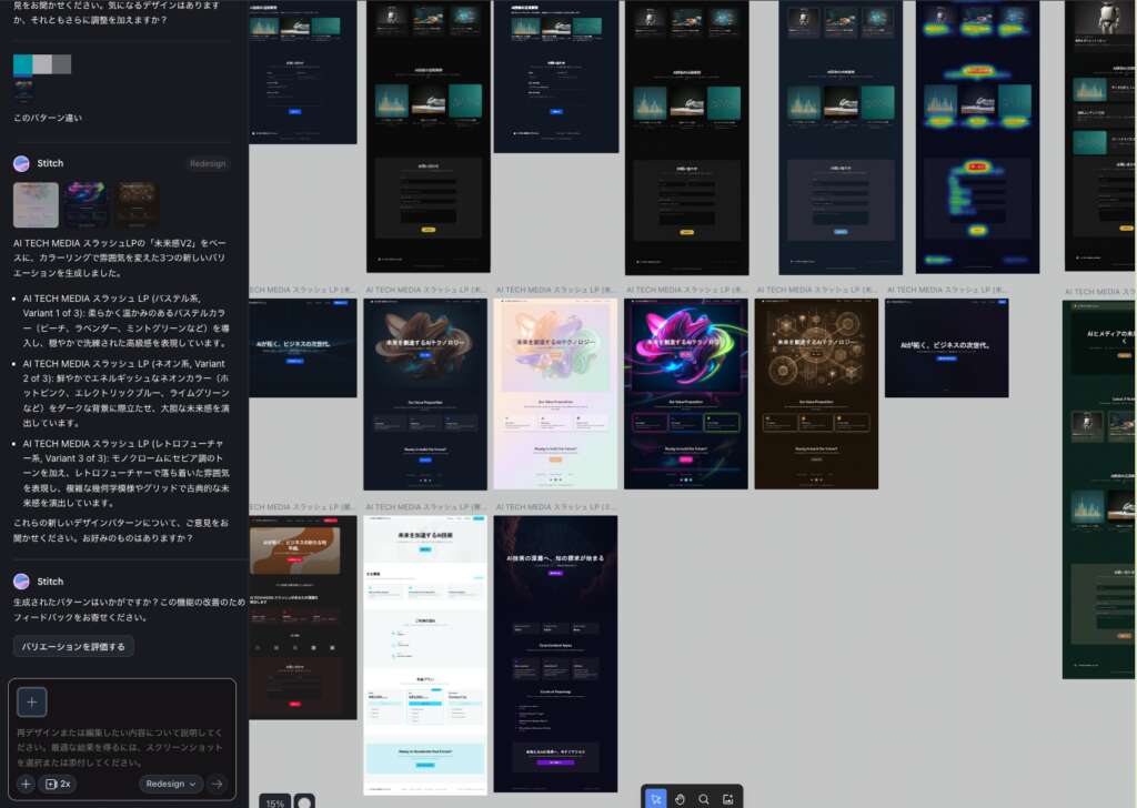 左側のチャットエリアでプロンプトを入力すると、中央・右側のエリアに複数のデザインバリエーションが数十秒で表示されます。ページを切り替えたり、細かい調整を加えたりする際も、待ち時間はほとんどありません。