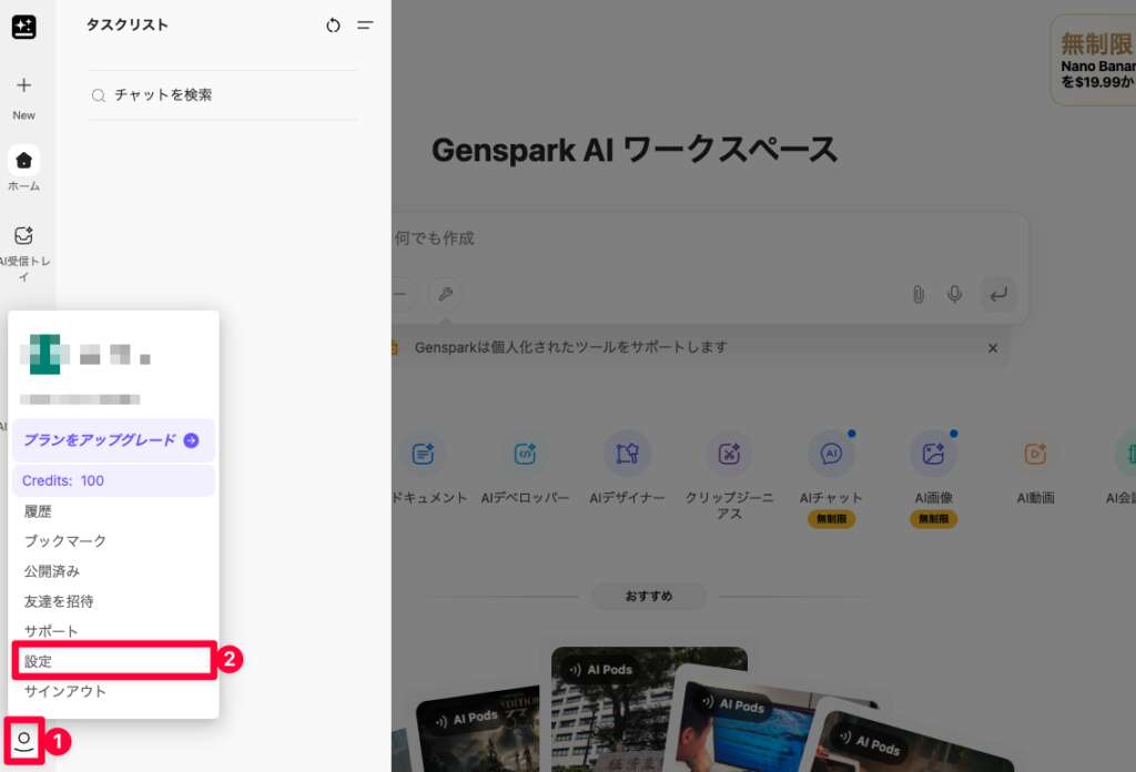 画面に記載されているCreditsとは、GenSparkを利用できる残高です。