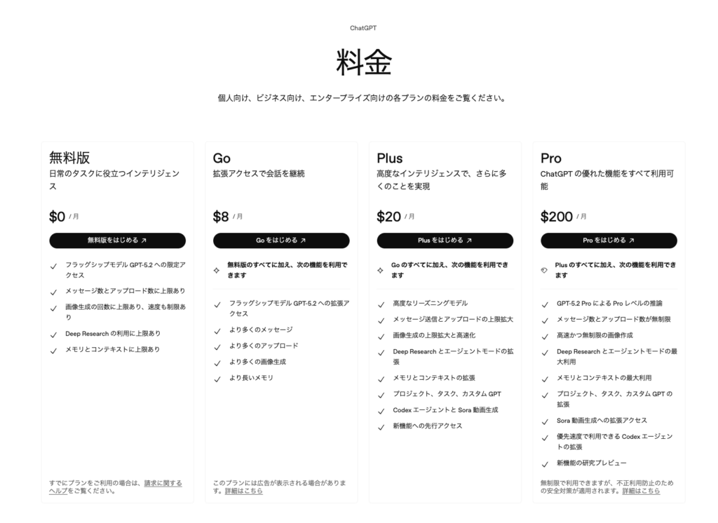 - ChatGPT Pro:米国200ドル、日本30,000円(広告なし)
