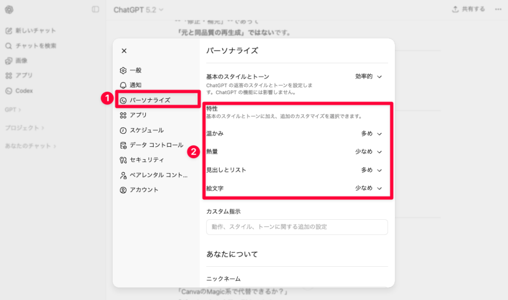 ※ パーソナリティ設定の基本については、こちらの記事をご参照ください→ 「フレンドリーすぎるGPT‑5.1」ChatGPTのパーソナライズ設定でビジネス向きトーンにする方法