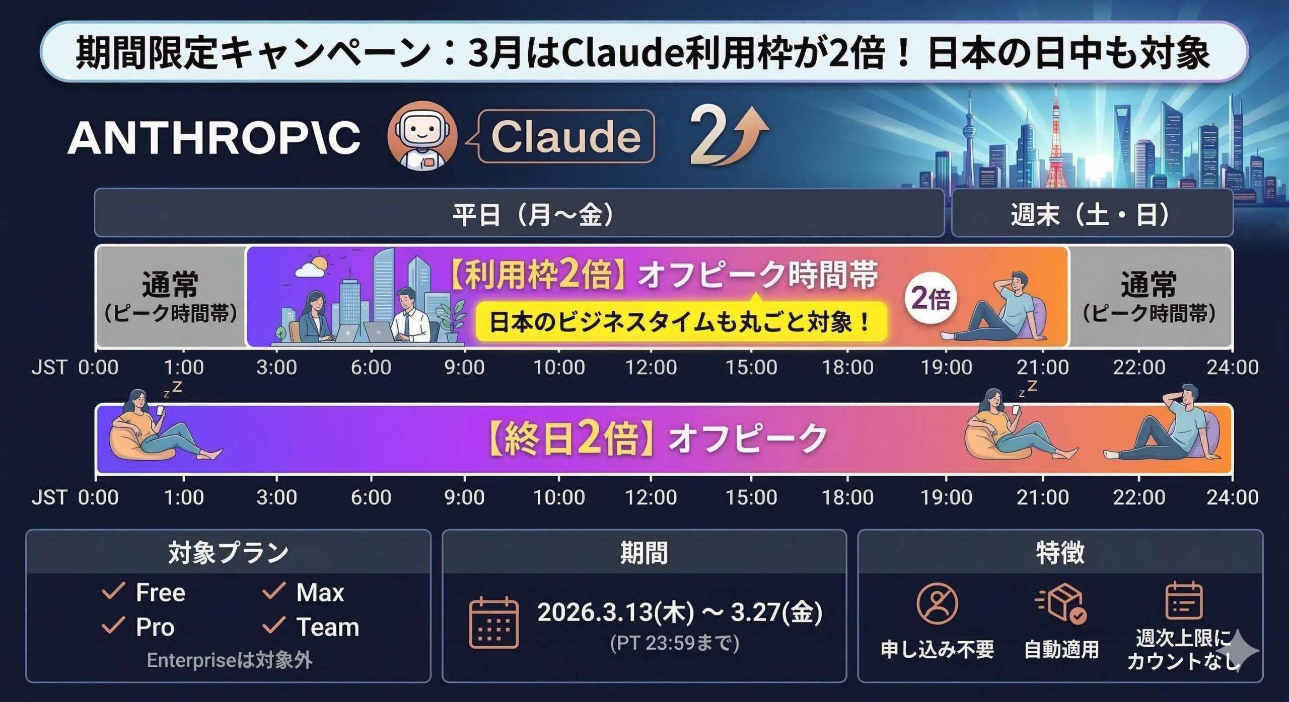Anthropicは2026年3月13日〜27日の期間、Claudeのオフピーク時間帯における利用上限を2倍にするキャンペーンを実施中です。日本時間では平日3:00〜21:00、週末は終日が2倍の対象となります。Free・Pro・Max・Teamプランが対象で、申し込み不要・自動適用のため、日本の日中帯に作業することが多いユーザーはこの機会を活用してみてください。